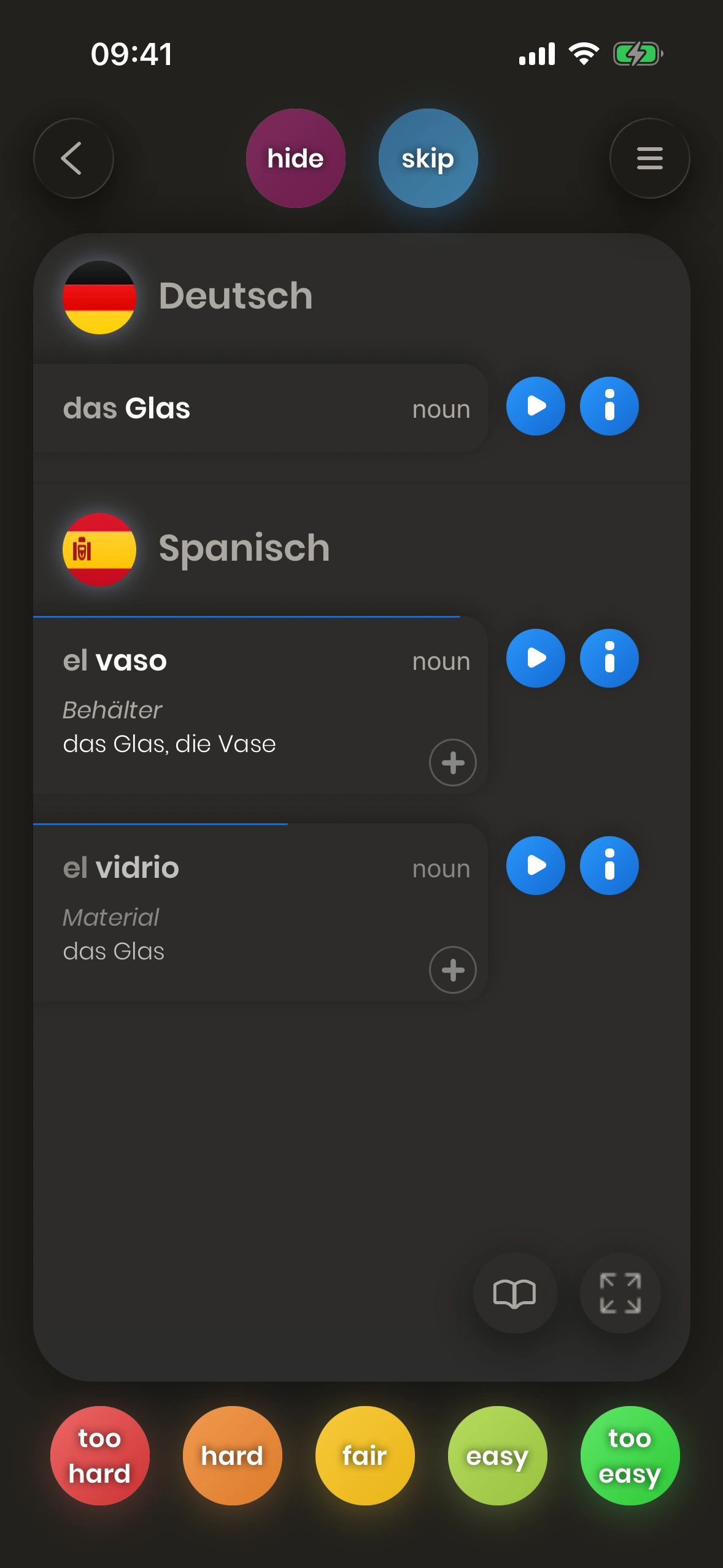 Du musst nicht alle kennen: Kannst du eine der ersten Übersetzungen nennen, gilt die Karte als „gelernt“. Mehr Details später.