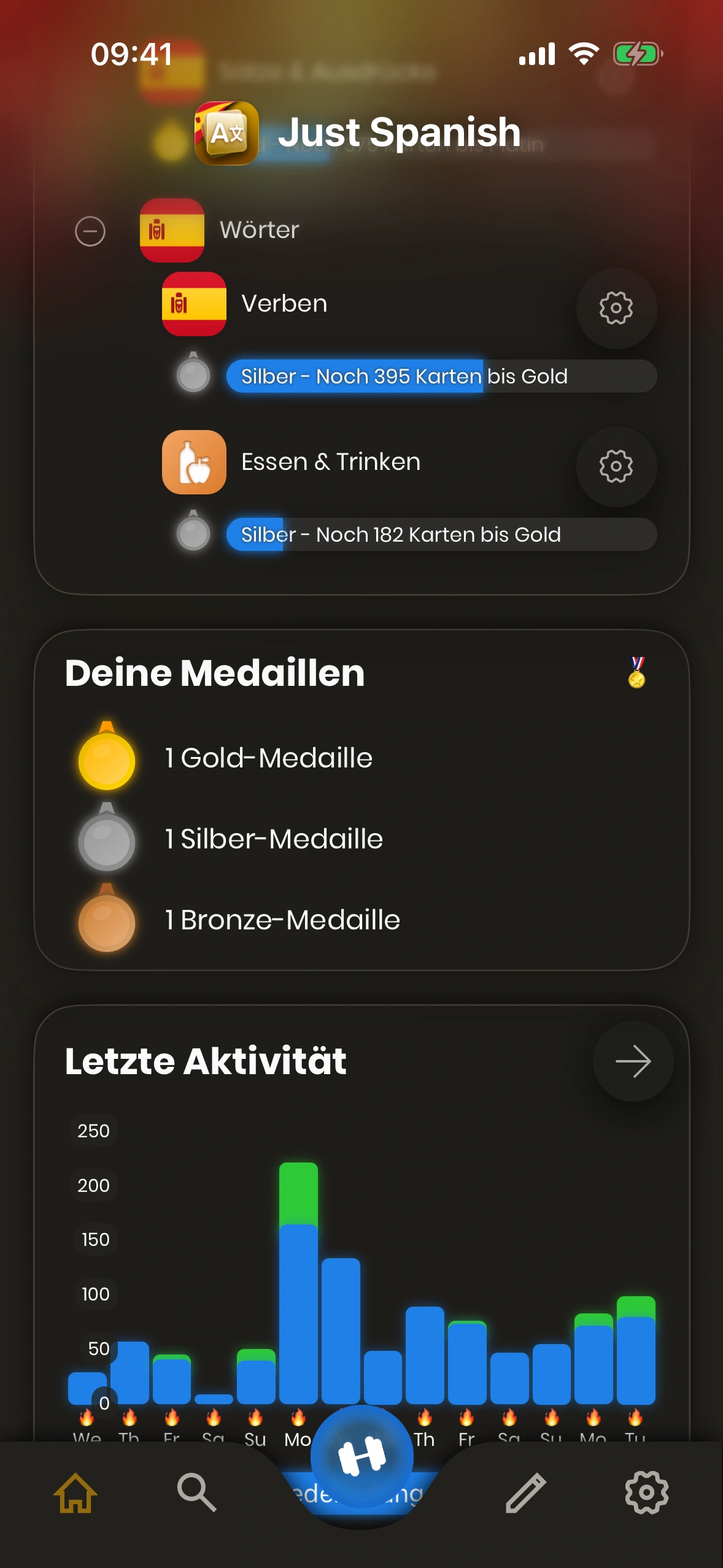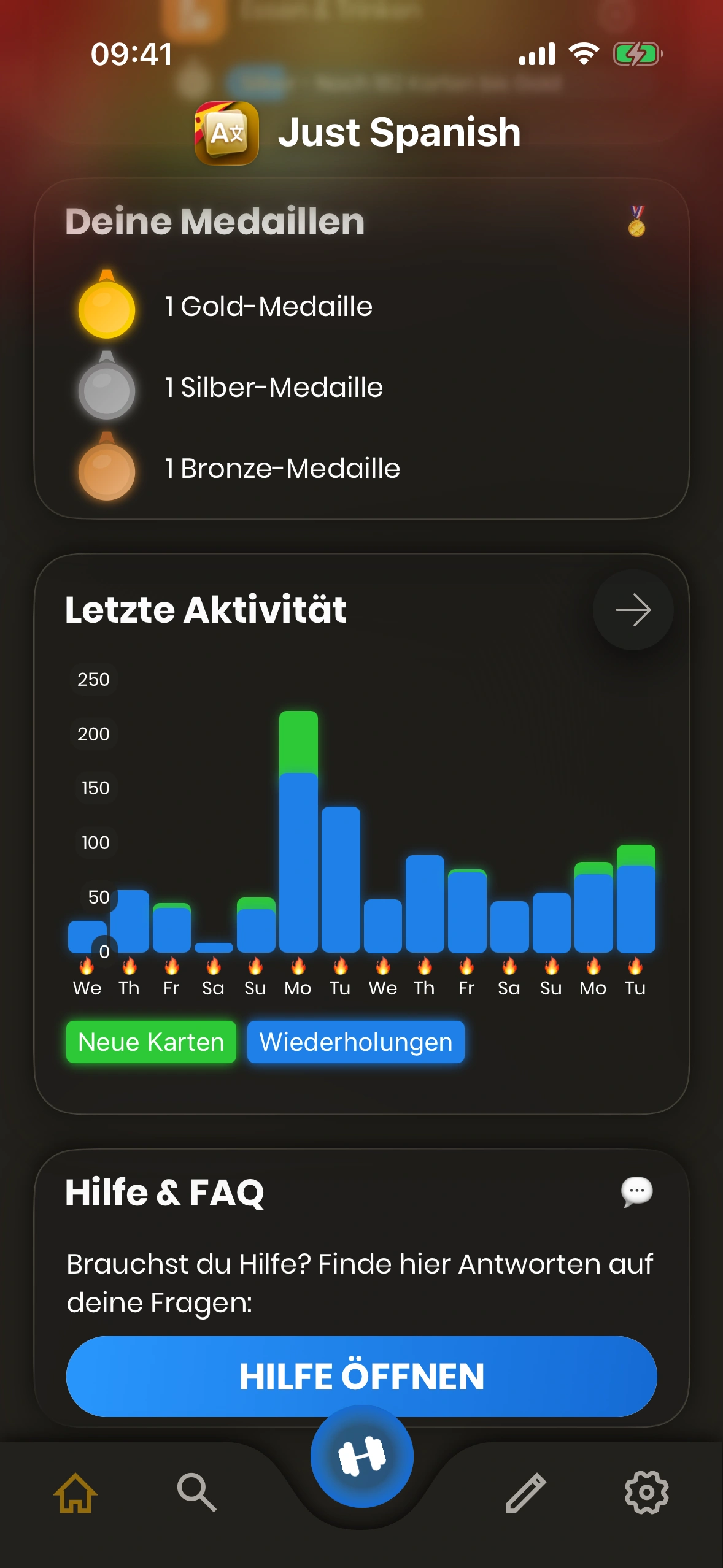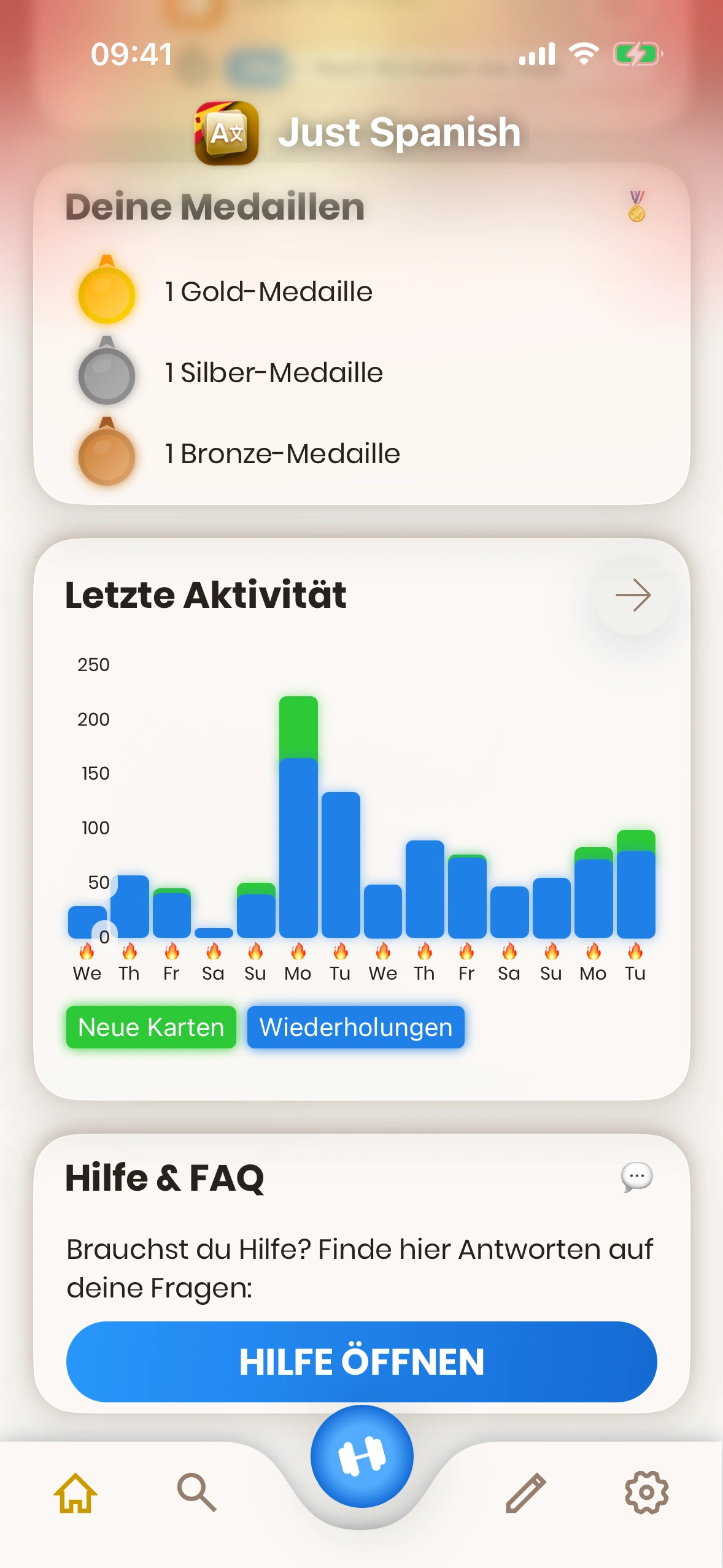 - Aktivität: Deine Aktivitäten der letzten Tage. Reviews in Blau, neue Karten in Grün. Tage mit 🔥 sind Streak‑Tage (Tagesziel erreicht). Über den Pfeil siehst du Details zur Verlaufshistorie.