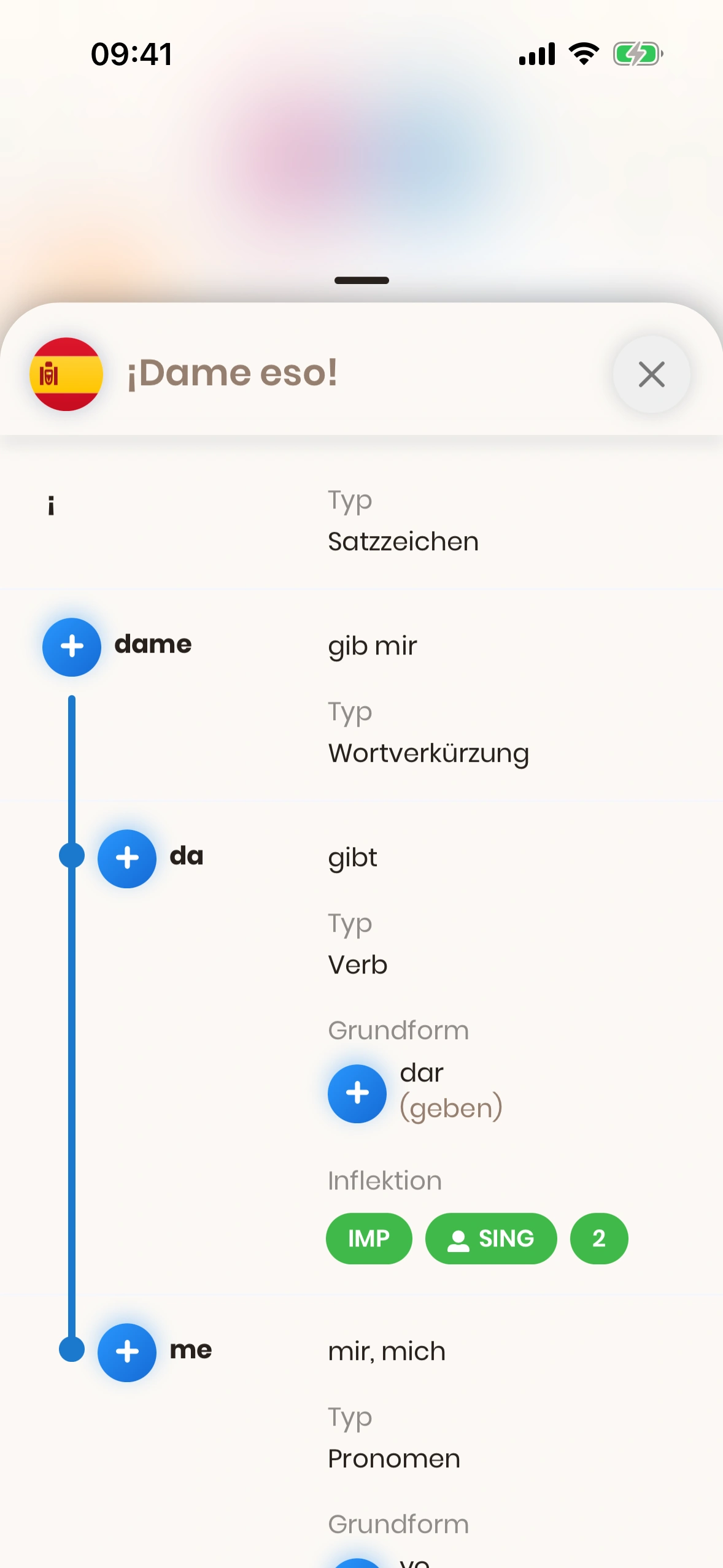 Der Satzstruktur‑Dialog erscheint, wenn du bei einer Satzkarte auf das (i) tippst – neben dem Satz in der Zielsprache.