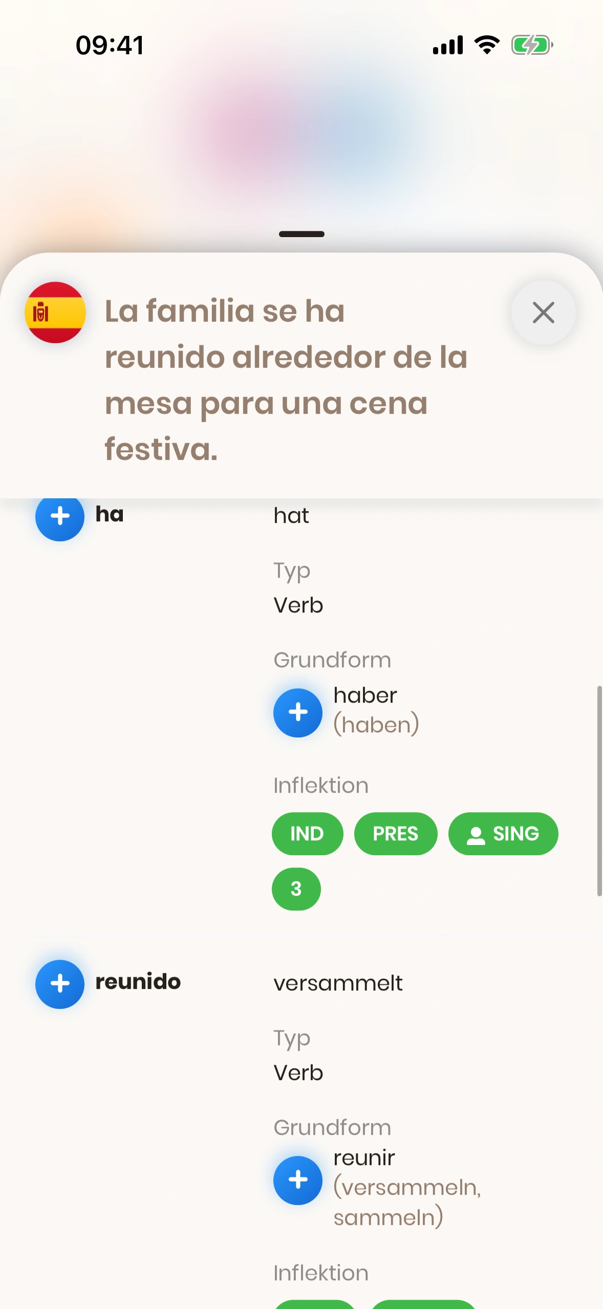 - Grundform: Bei gebeugten Wörtern zeigen wir die Grundform mit Übersetzungen.