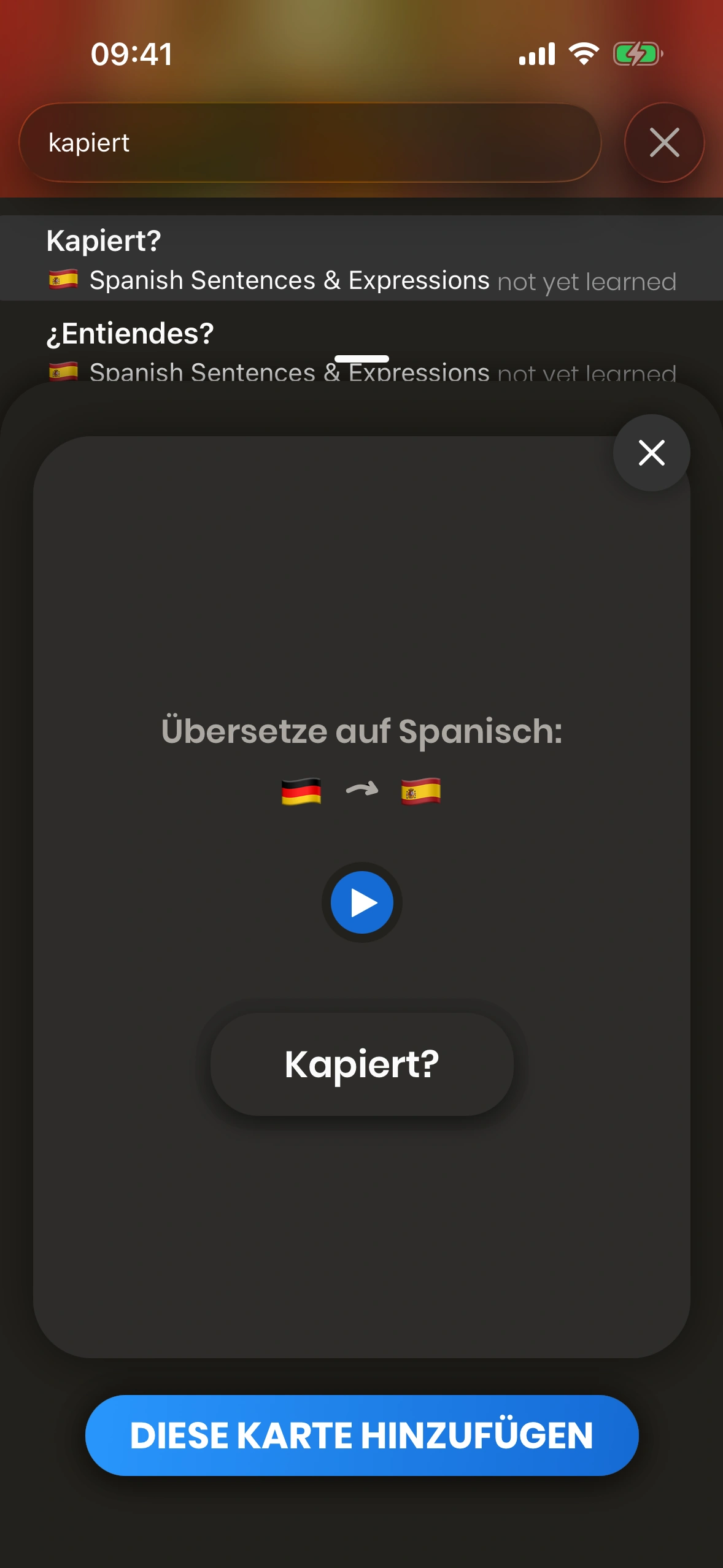 Tippe auf ein Suchergebnis. In dem Popup kannst du die Karte deiner Lern‑Warteschlange hinzufügen.