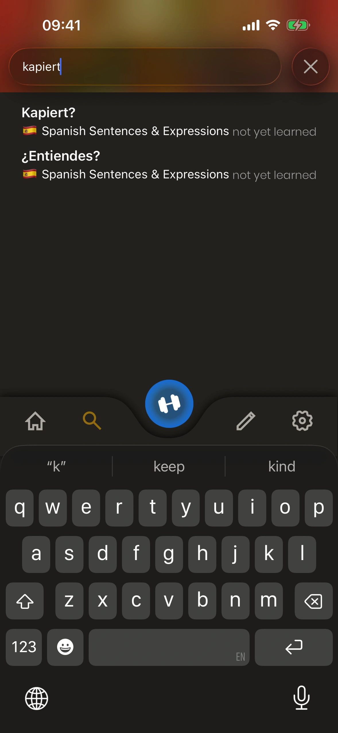Just Spanish bietet ein vollwertiges Wörterbuch – jeder Eintrag ist eine Karte, die du zu deiner Lern ‑Warteschlange hinzufügen kannst!