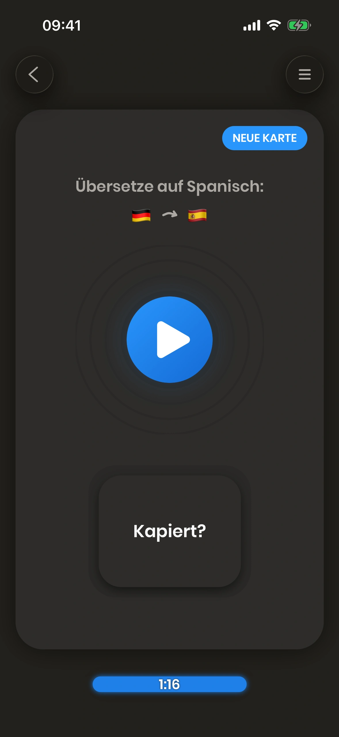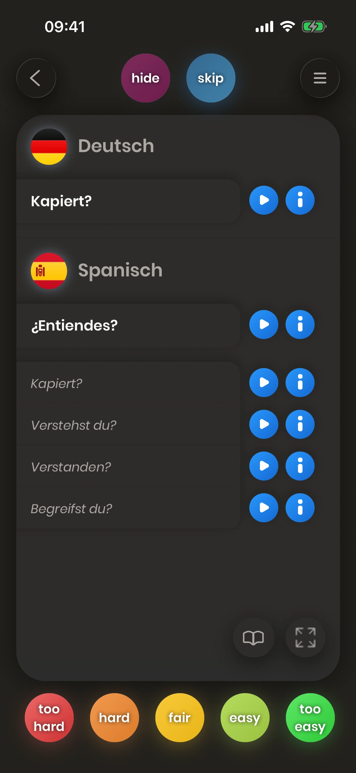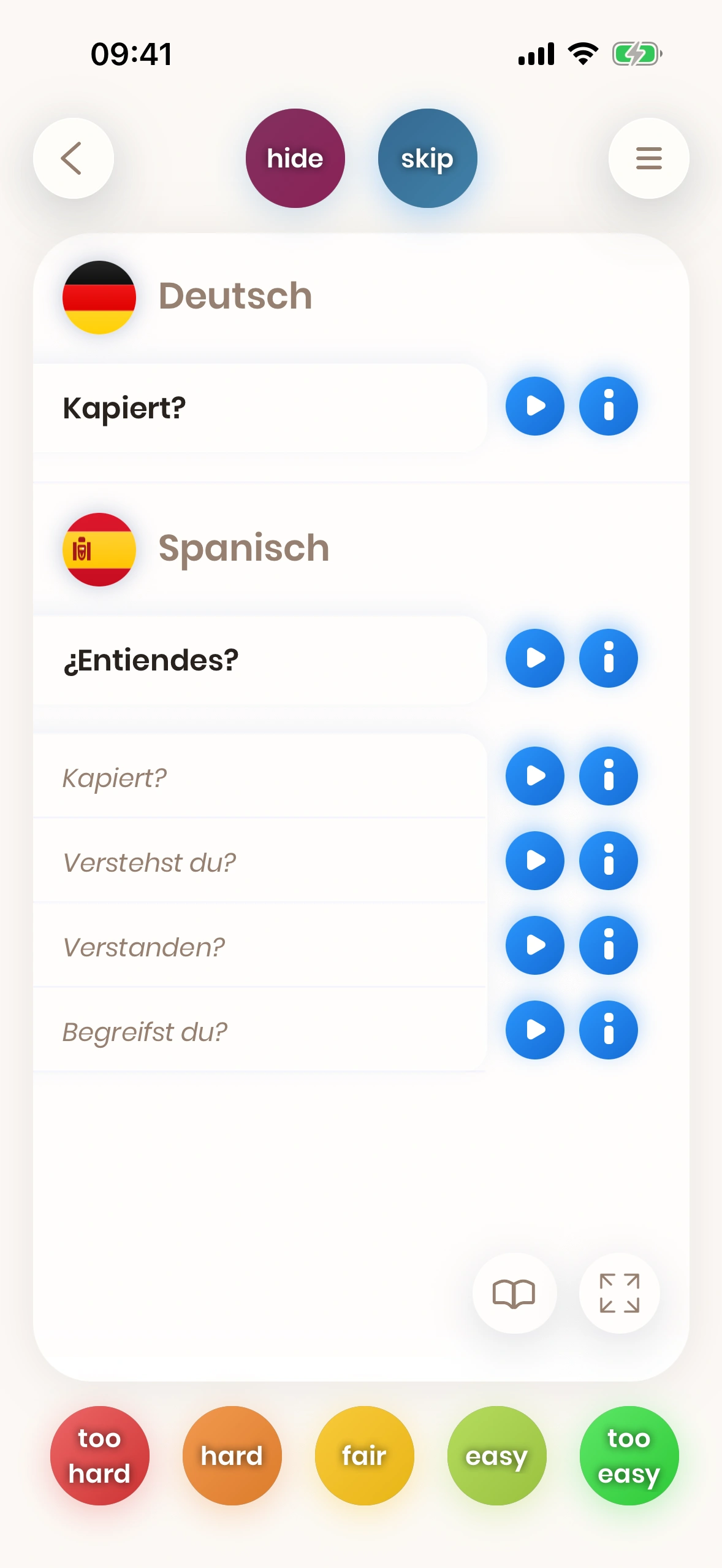 Wenn die Übersetzung eines Wortes oder einer Phrase für dich schwierig ist, dann musst du es öfter üben. Aus diesem Grund wird die Karte bald wieder gezeigt, wenn du einen roten Button wie too hard drückst, damit du das Wort oder die Phrase öfter üben kannst.