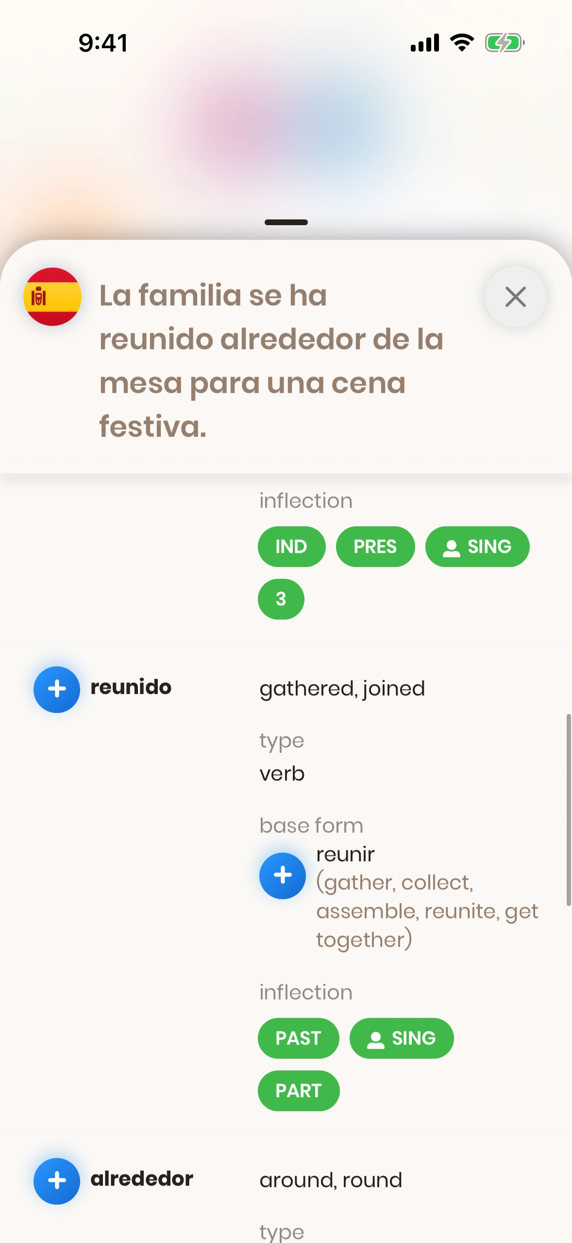The Sentence Structure Modal will be shown if you press the (i) button on a sentence card, next to a sentence in Spanish.