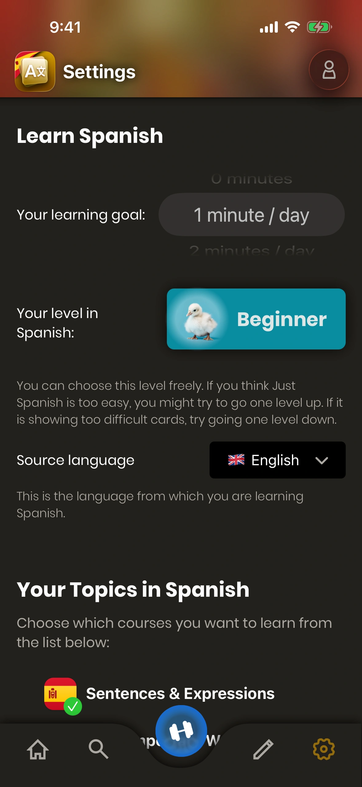 If you feel like Just Spanish is showing you cards that are too easy (or too repetitive) or too difficult, then it might make sense to change the language level.
