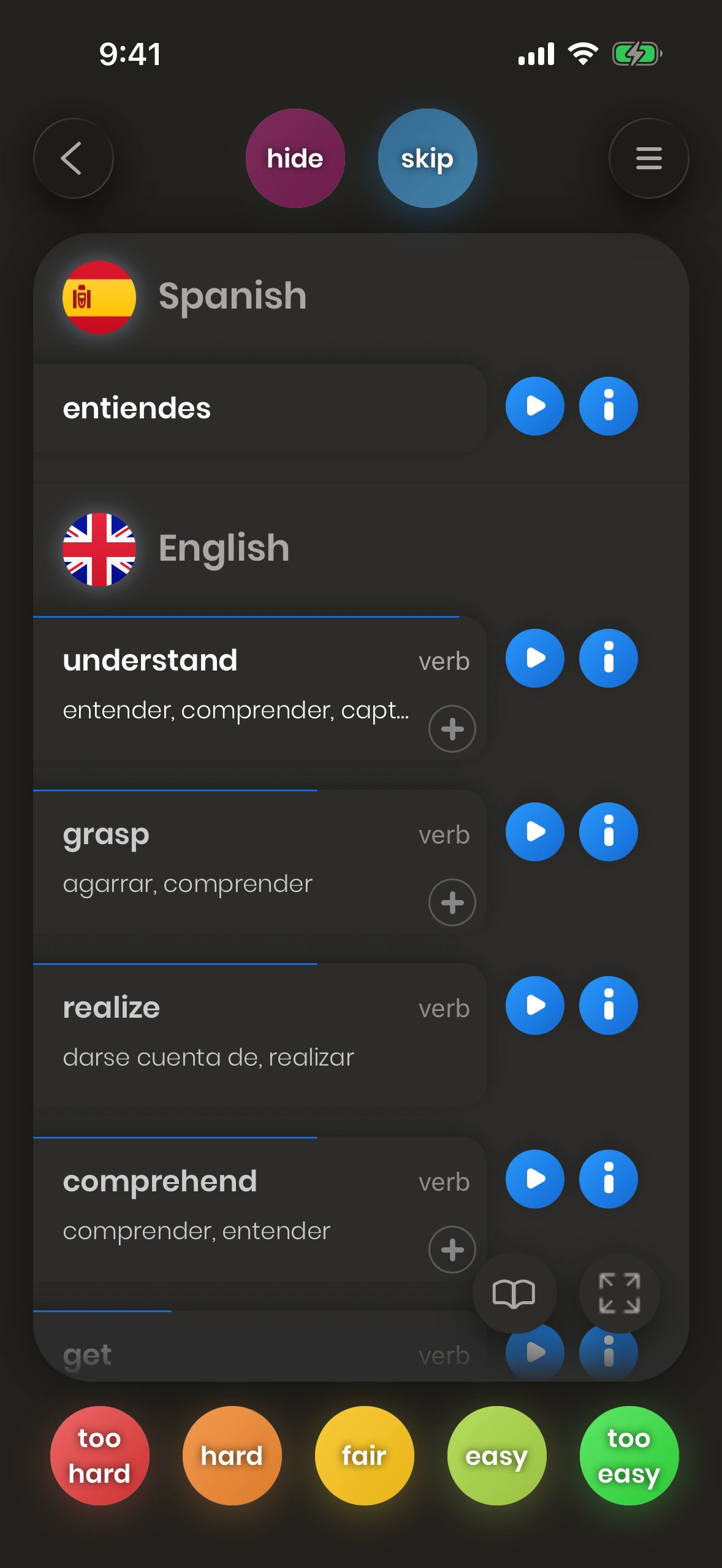 Now, if you are happy with your translation, you press one of the green buttons, for example easy. If not, one of the red buttons, like hard.