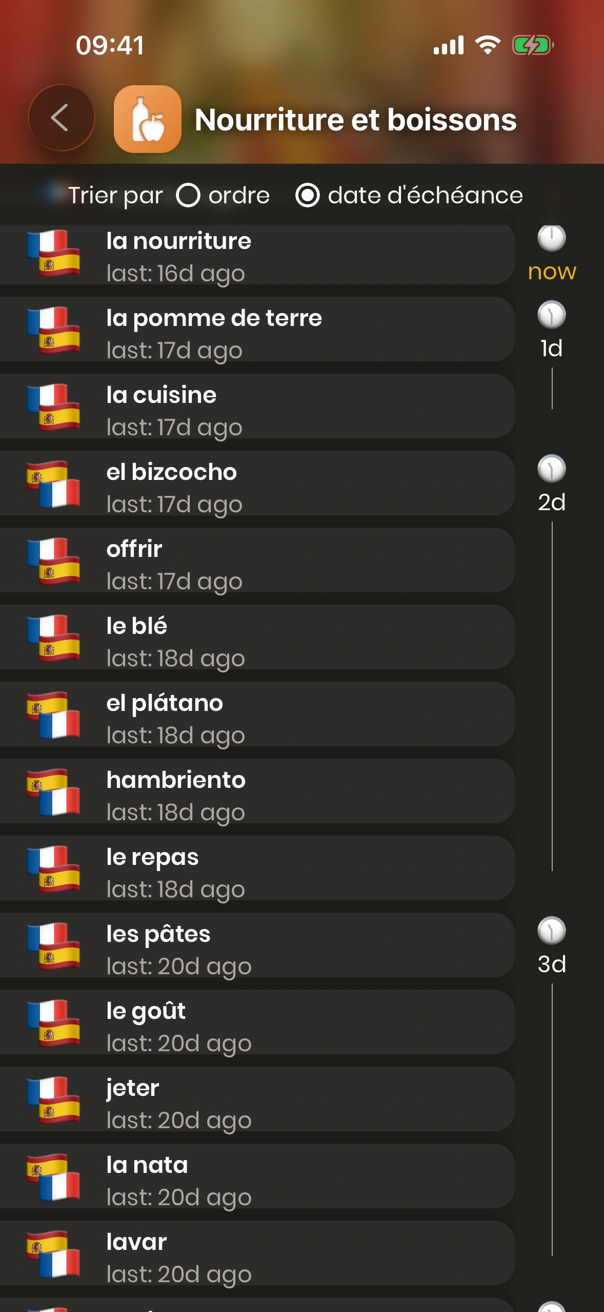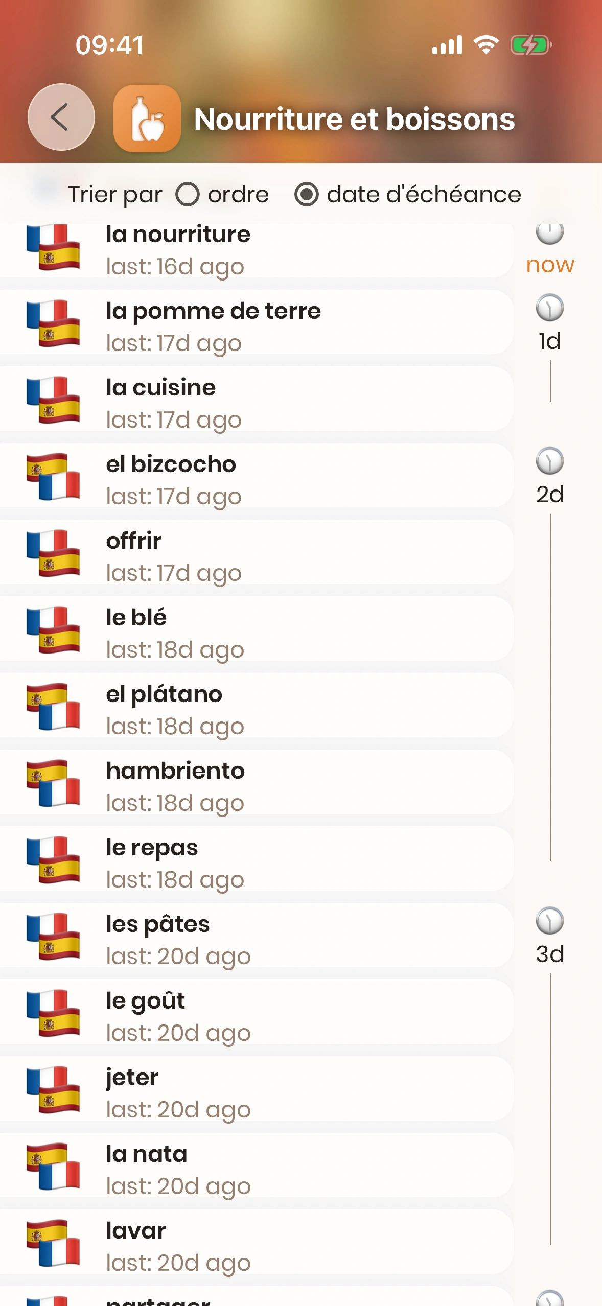 - « par date d'échéance » affiche les cartes dans l'ordre où tu dois les réviser — d'abord les cartes qui doivent être révisées maintenant, puis progressivement les cartes qui doivent être révisées dans le futur.