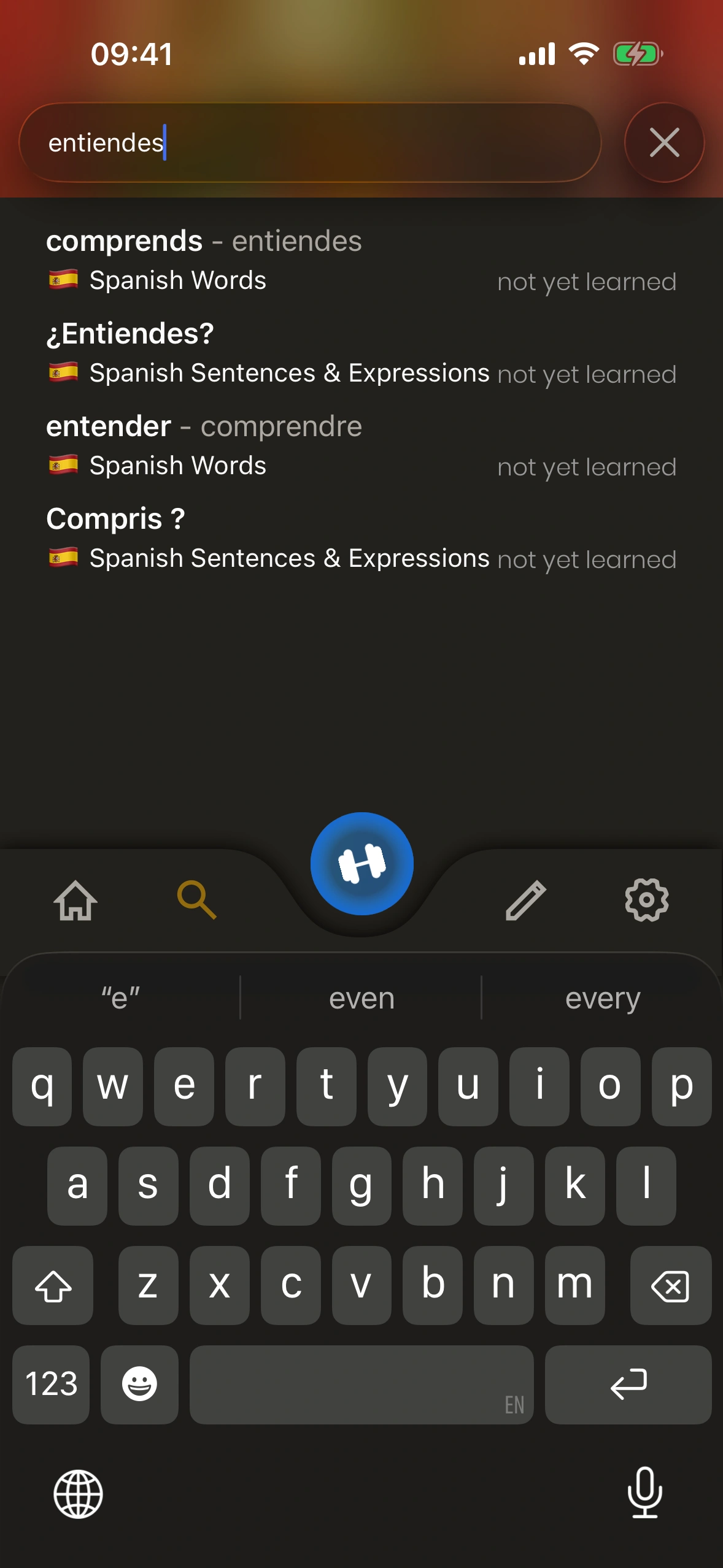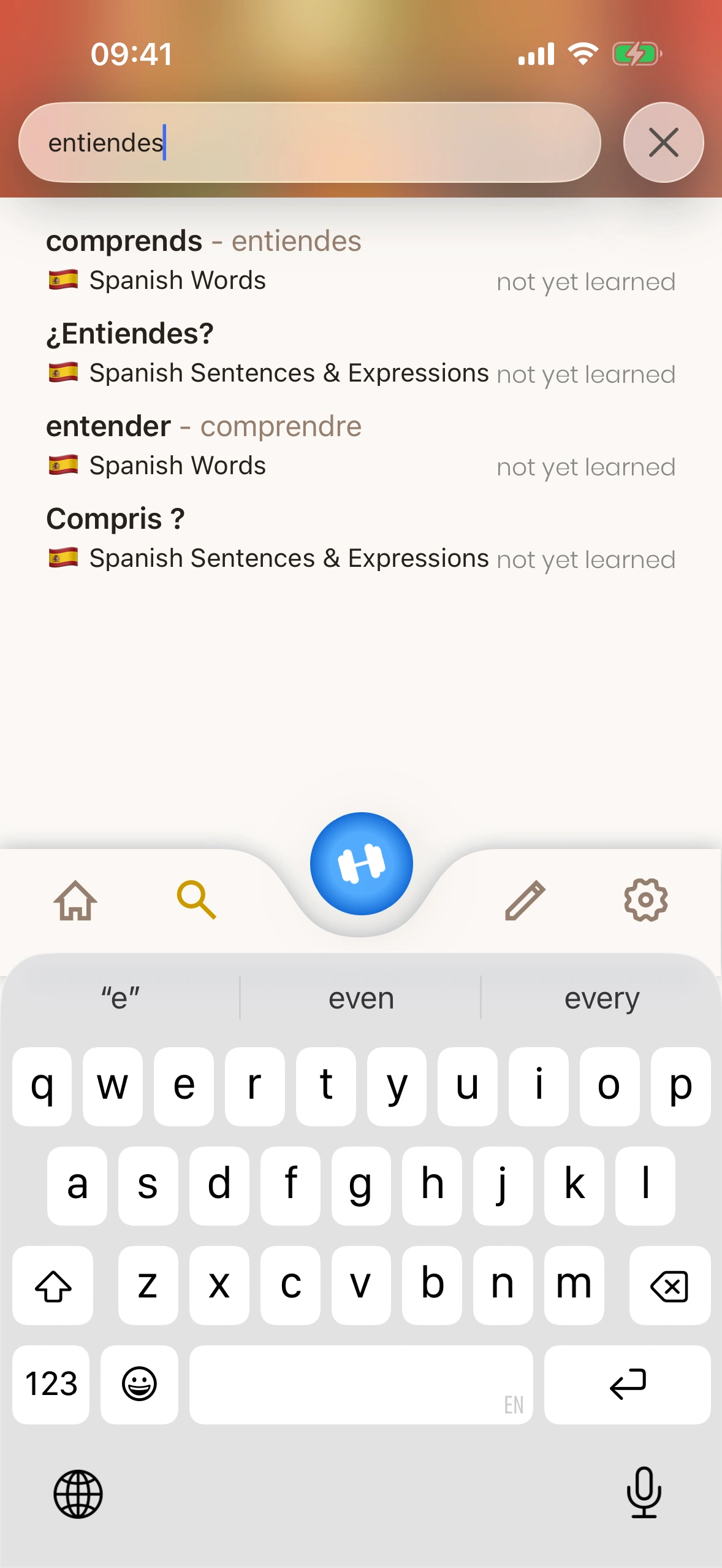 Just Spanish offre un dictionnaire complet, où chaque entrée de dictionnaire est une carte que tu peux ajouter à ta file d'apprentissage !