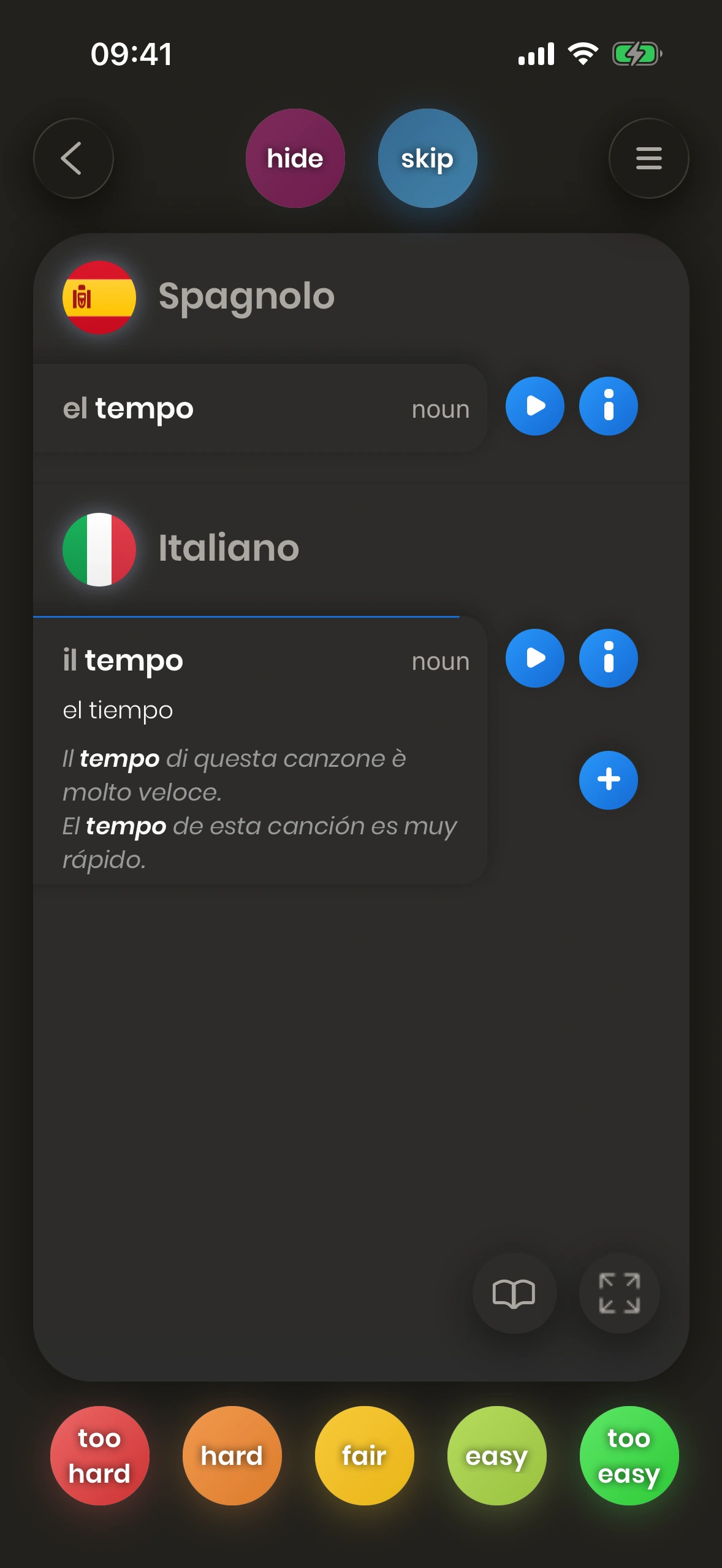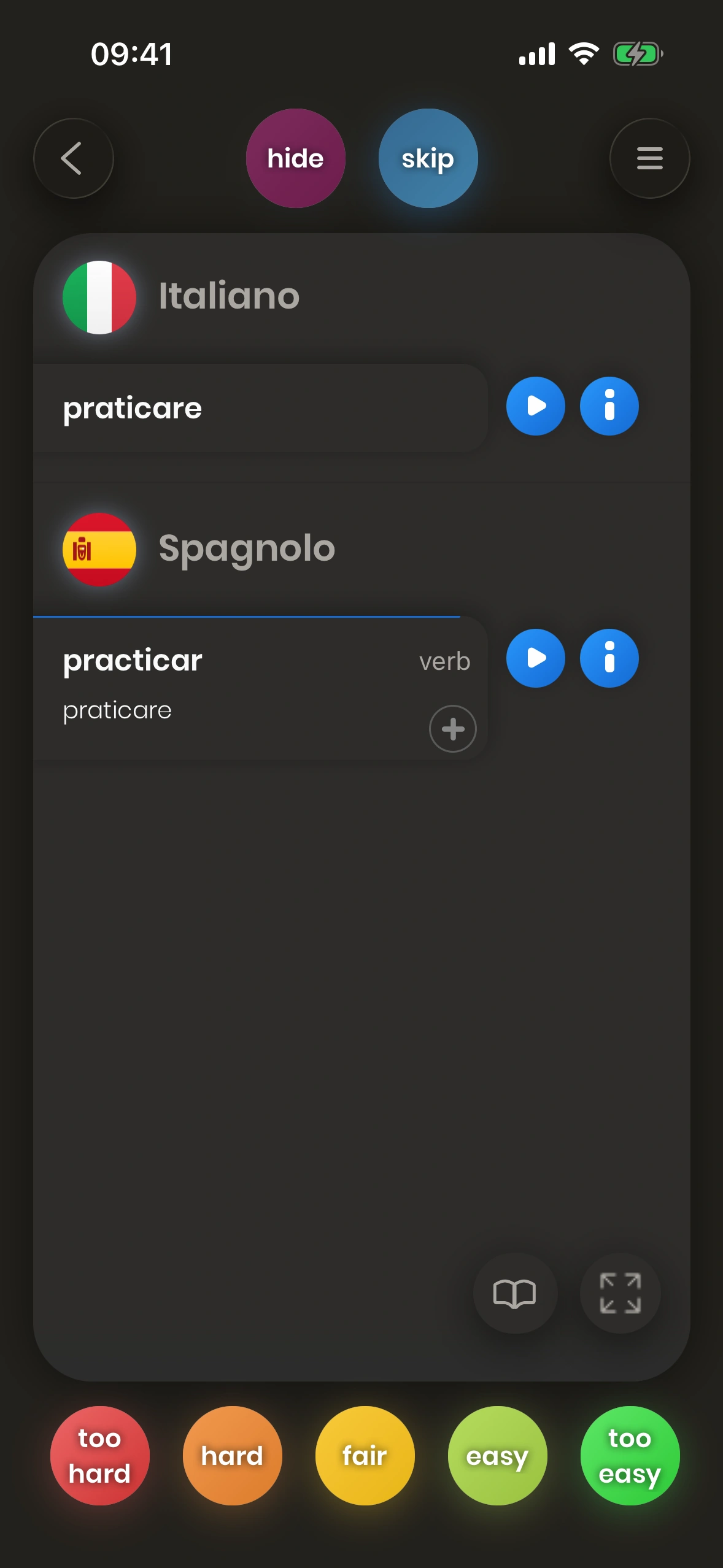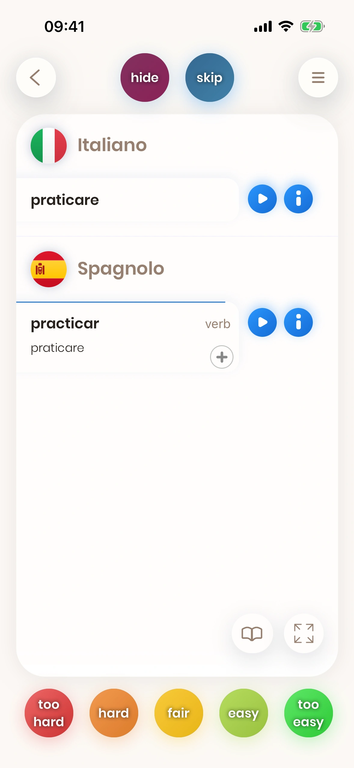 Guarda una carta. Prova a tradurre la parola o la frase. Gira la carta. Dicci quanto era difficile. Le parole e frasi difficili vengono mostrate di nuovo presto.