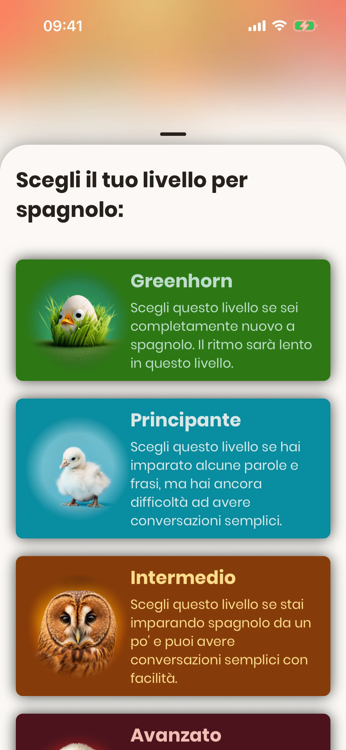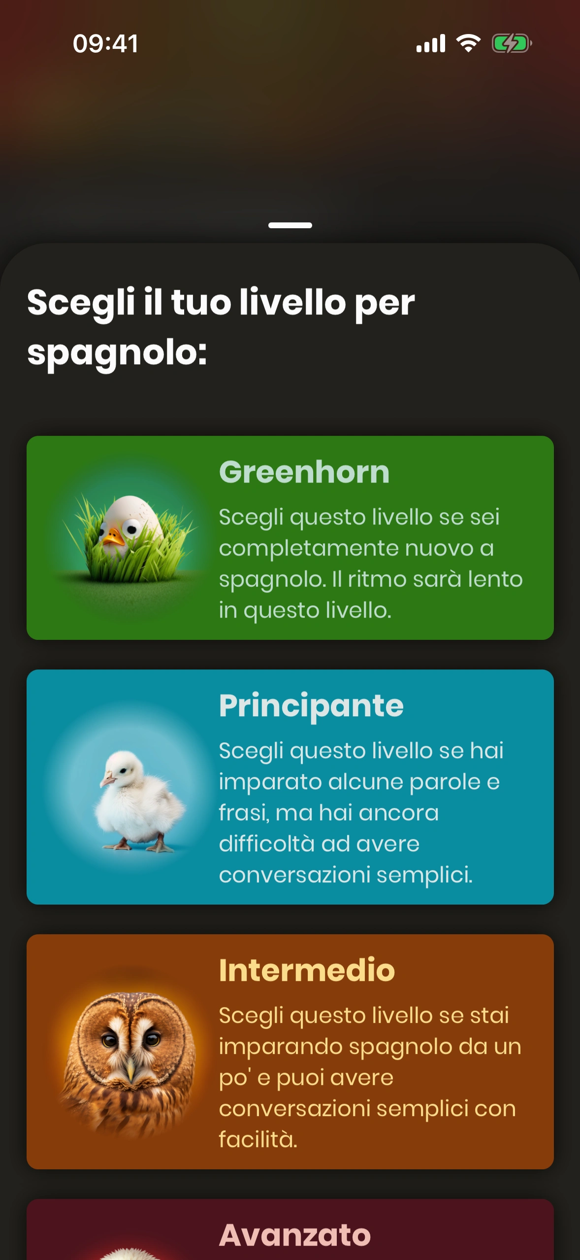 Nel tutorial che fai al primo avvio dell'app, Just Spanish valuta le tue capacità linguistiche e ti propone un livello. Ti consigliamo di accettare questo livello, ma puoi cambiarlo in qualsiasi momento.