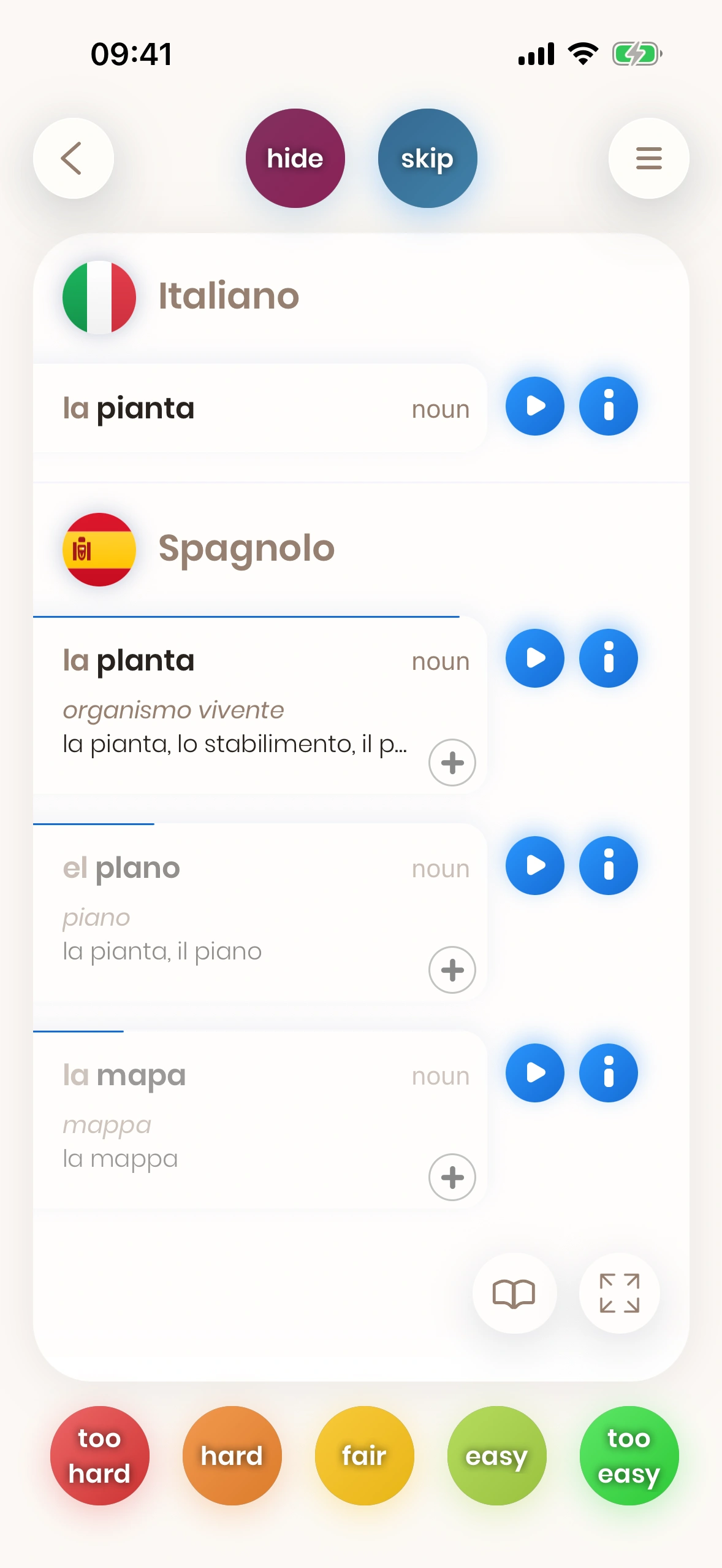 Queste carte allenano il tuo vocabolario attivo. Inizi a cercare parole spagnole attivamente e a usarle.