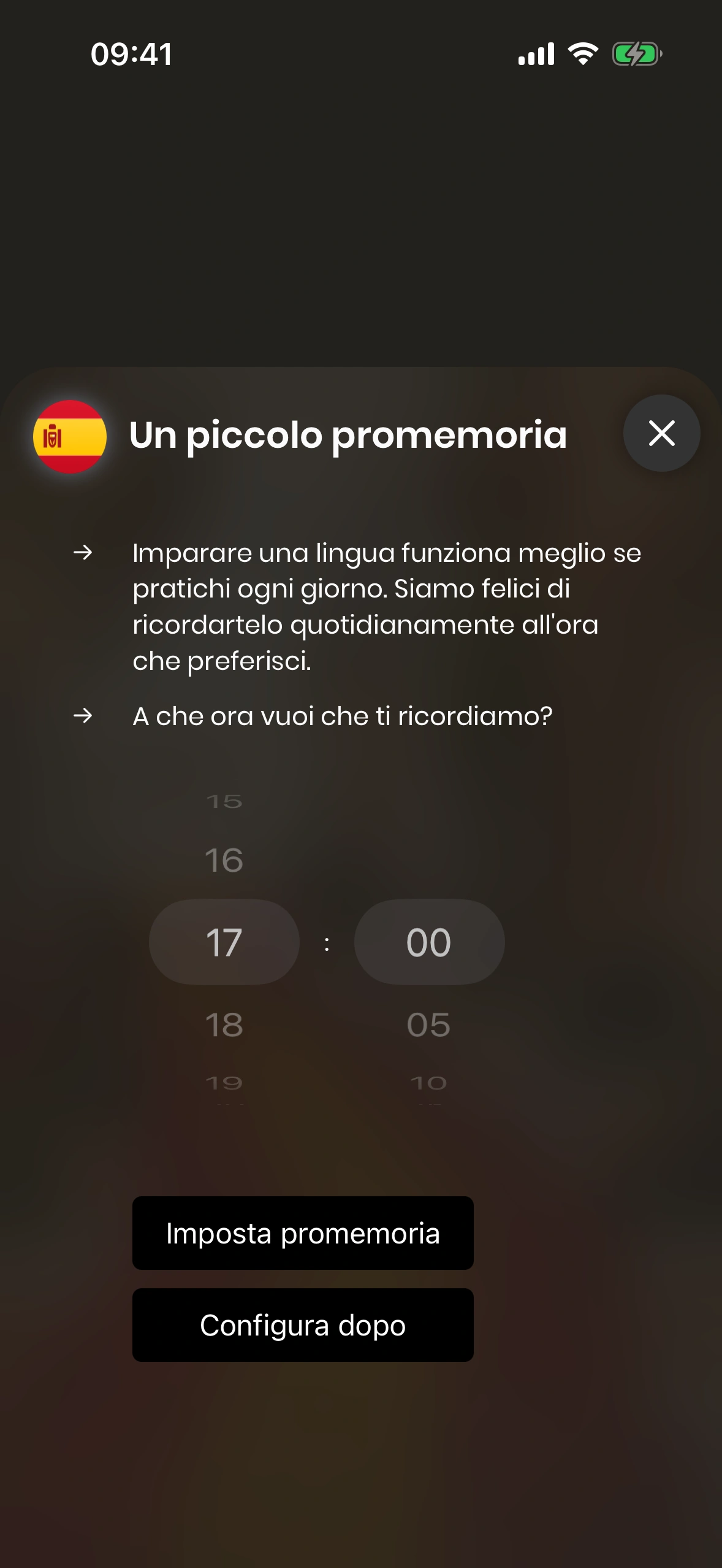 - Con la giornata già impegnata tra lavoro, famiglia e amici, è facile dimenticare la lezione quotidiana. Ecco perché Just Spanish offre una funzione di promemoria giornaliero. Puoi attivarlo durante il tutorial, nonché nelle impostazioni.