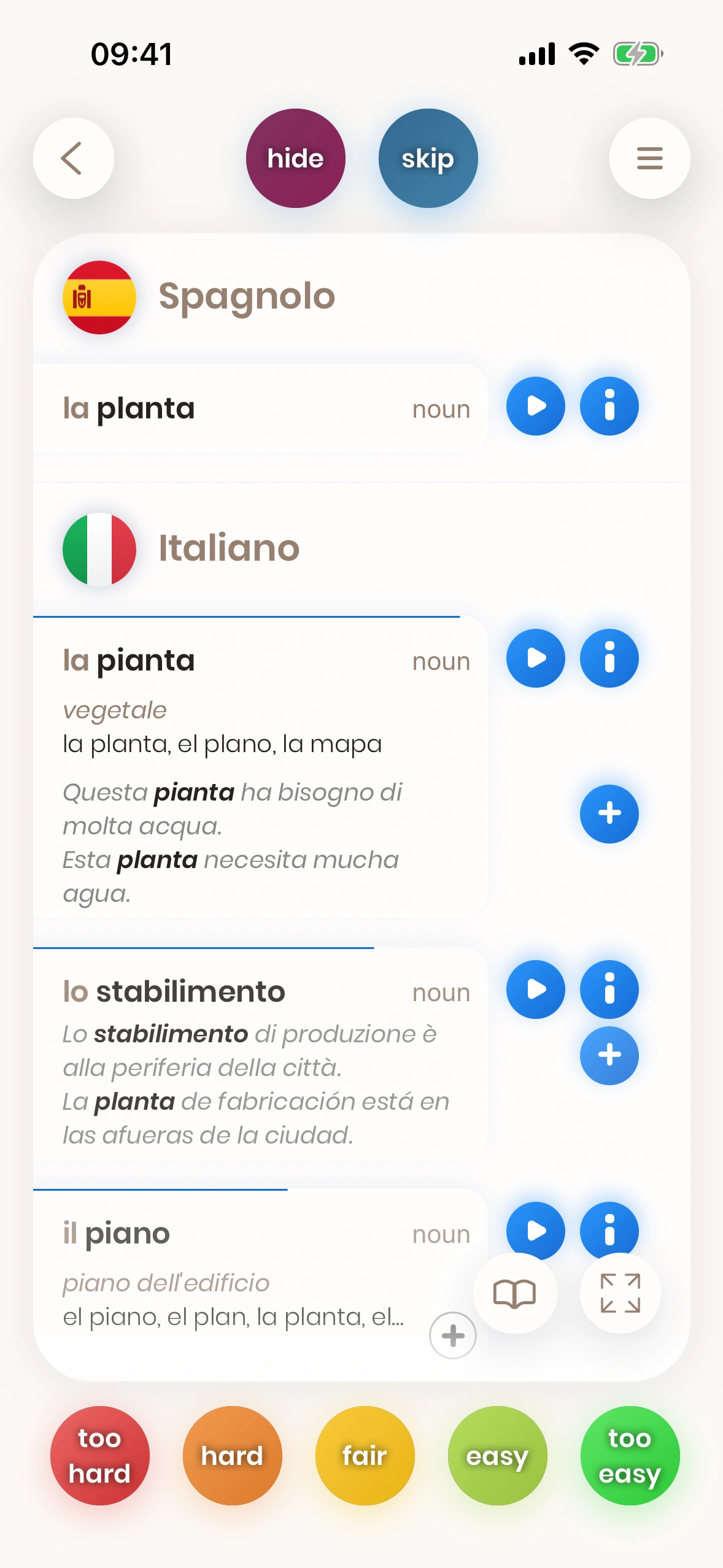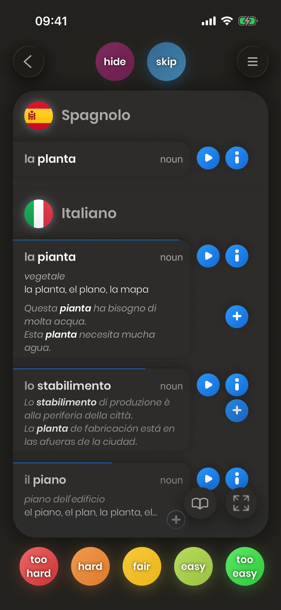 Il pulsante Aggiungi per le parole è disponibile in vari punti di Just Spanish. Offre le seguenti opzioni quando lo tocchi: