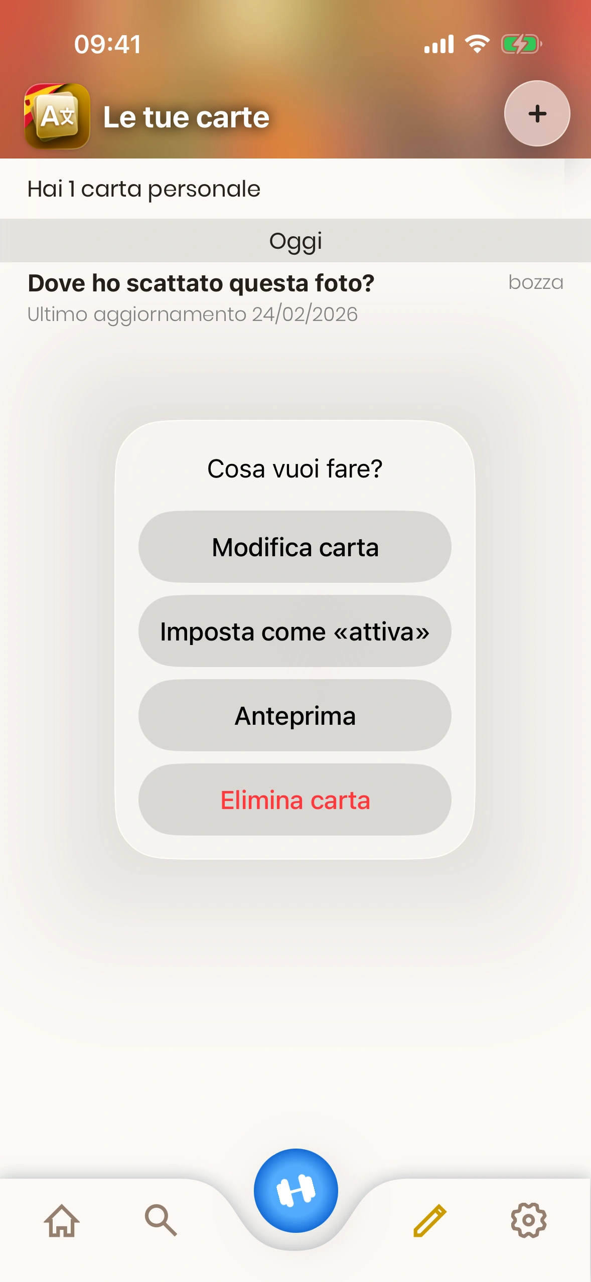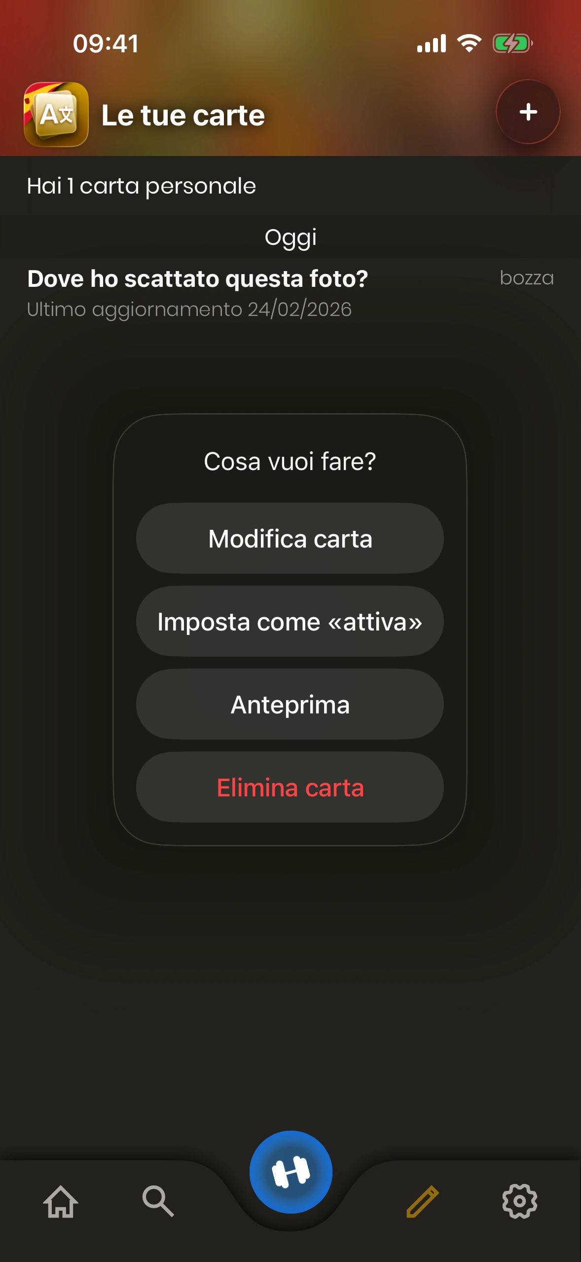 4. Stato carta: Una carta personale è in modalità "bozza" o "attiva". Le carte in bozza non vengono mostrate durante l'apprendimento. Per cambiare lo stato di una carta, toccala.
