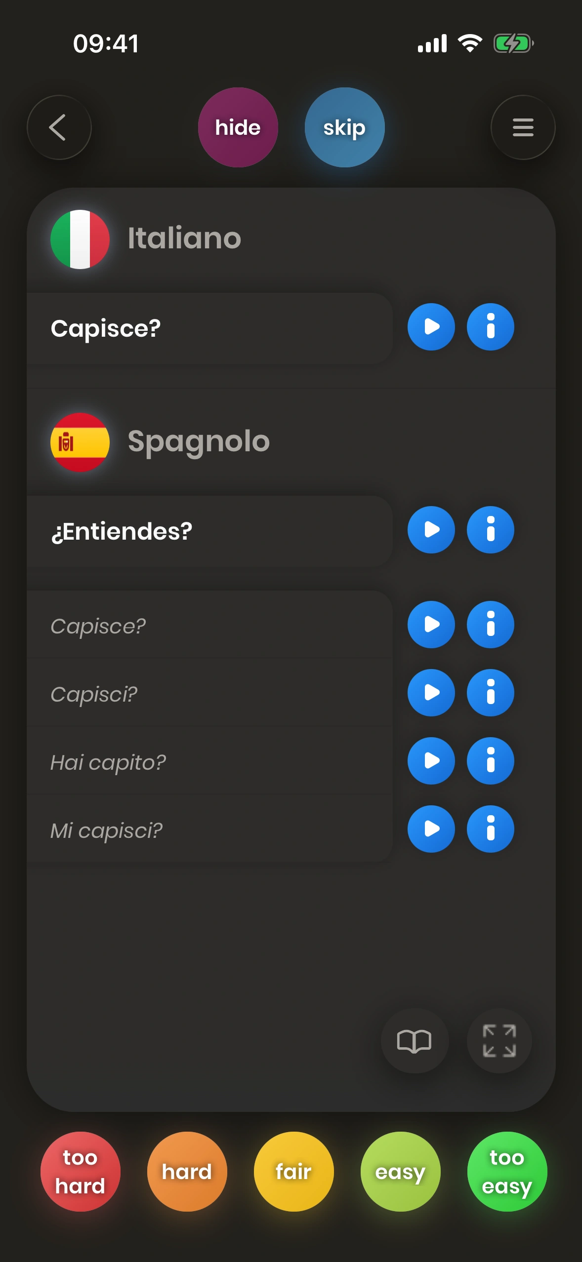 Se tradurre una parola o una frase è difficile per te, devi esercitarti più spesso. Per questo motivo, se premi un tasto rosso come too hard, la carta verrà mostrata di nuovo presto, così puoi esercitarti sulla parola o sulla frase più spesso.