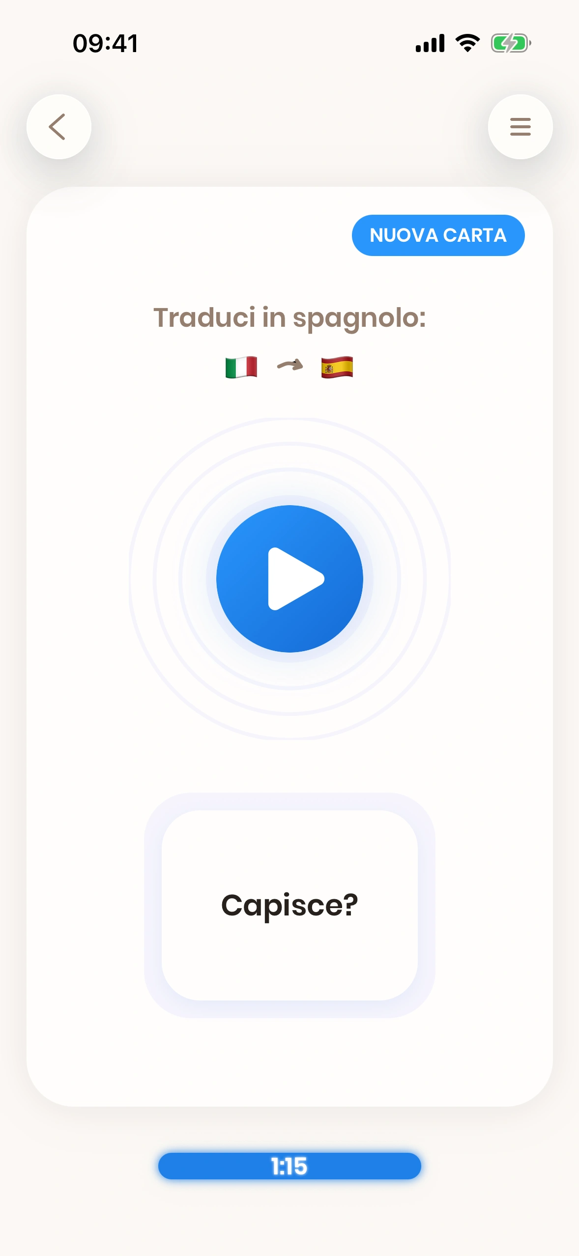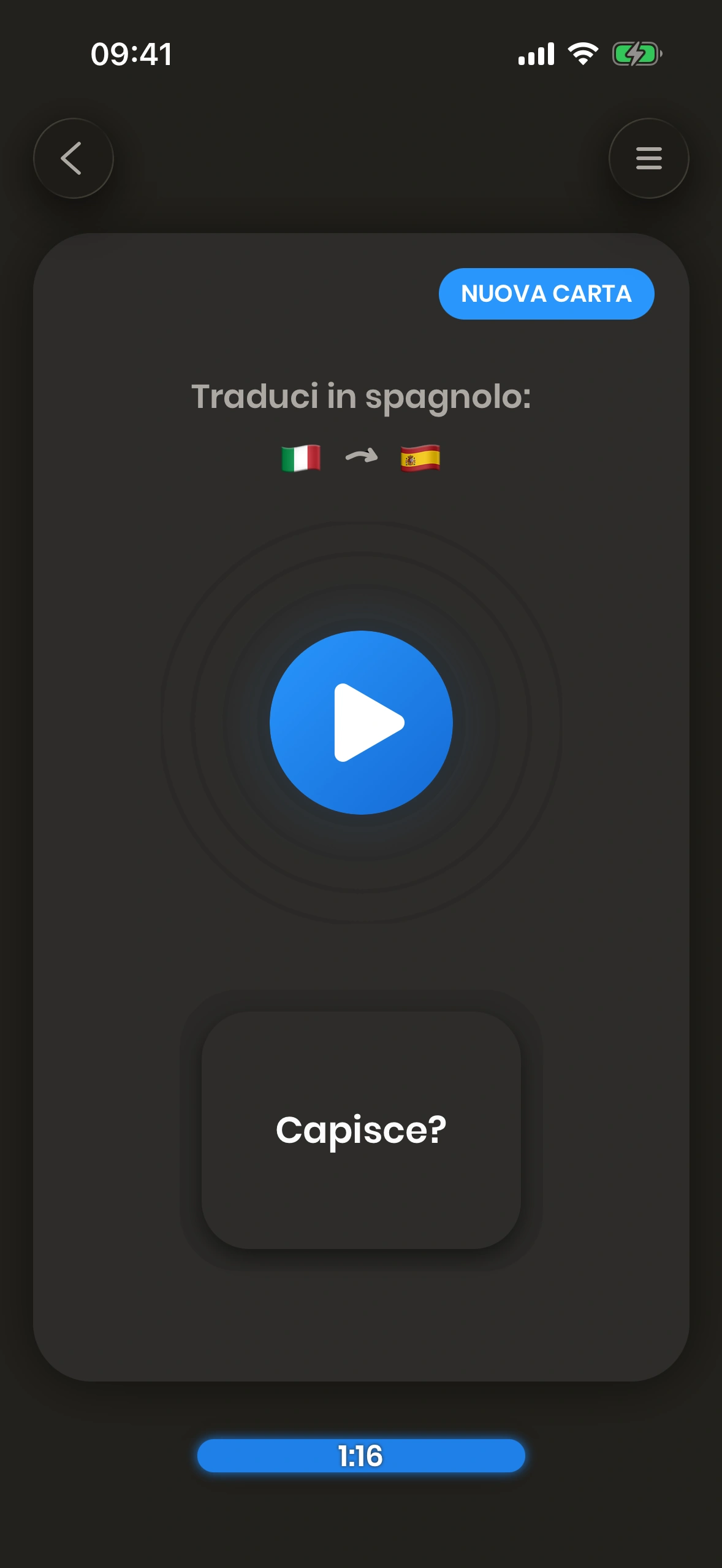 Il fronte di una carta, che mostra una frase da tradurre.